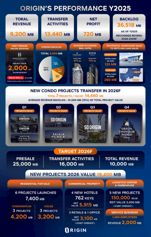 ทั้งนี้ ORIGIN ประกาศทิศทางการดำเนินธุรกิจ ปี 2569 ภายใต้กลยุทธ์ “ORIGIN Portfolio Evolution 2026 วิวัฒนาการพอร์ตธุรกิจ สู่การเติบโตอย่างยั่งยืน” เพื่อสร้างความมั่นคงและพร้อมรับมือกับความเปลี่ยนแปลง ขับเคลื่อนธุรกิจให้เติบโตในทุกมิติ ตั้งเป้ายอดขาย 25,000 ล้านบาท และรายได้รวม 10,000 ล้านบาท วางแผนเปิดตัวโครงการใหม่มูลค่ารวมทั้งหมด 19,400 ล้านบาท ประกอบไปด้วย คอนโด ORIGIN VERTICAL และ บ้าน BRITANIA รวม 6 โครงการ มูลค่ารวม 7,400 ล้านบาท ธุรกิจโรงแรม 4 โรงแรม มูลค่ารวม 5,900 ล้านบาท* ธุรกิจอาคารสำนักงานและพื้นที่เชิงพาณิชย์ ที่จะเริ่มเปิดดำเนินการได้รวม 4 แห่ง มูลค่ารวม 3,100 ล้านบาท* และธุรกิจคลังสินค้าและโรงงานที่จะพร้อมให้เช่าอีก 5 โครงการ กว่า 150,000 ตารางเมตร มูลค่ารวม 3,000 ล้านบาท* บริษัทฯมั่นใจผลการดำเนินงานทั้งปีเป็นไปตามกลยุทธ์ที่วางไว้ พร้อมกันนี้ยังมีแผนที่จะทำ Origin Vacation Club เพื่อเพิ่มมูลค่าและประสบการณ์การอยู่อาศัยให้กับลูกค้าของ ORIGIN VERTICAL และ BRITANIA ในโครงการหรือในทำเลต่างๆ โดยมี HHR เป็นผู้ดูแล ตามแผนสร้างการเติบโตและการดูแลผู้บริโภคแบบไม่สิ้นสุด