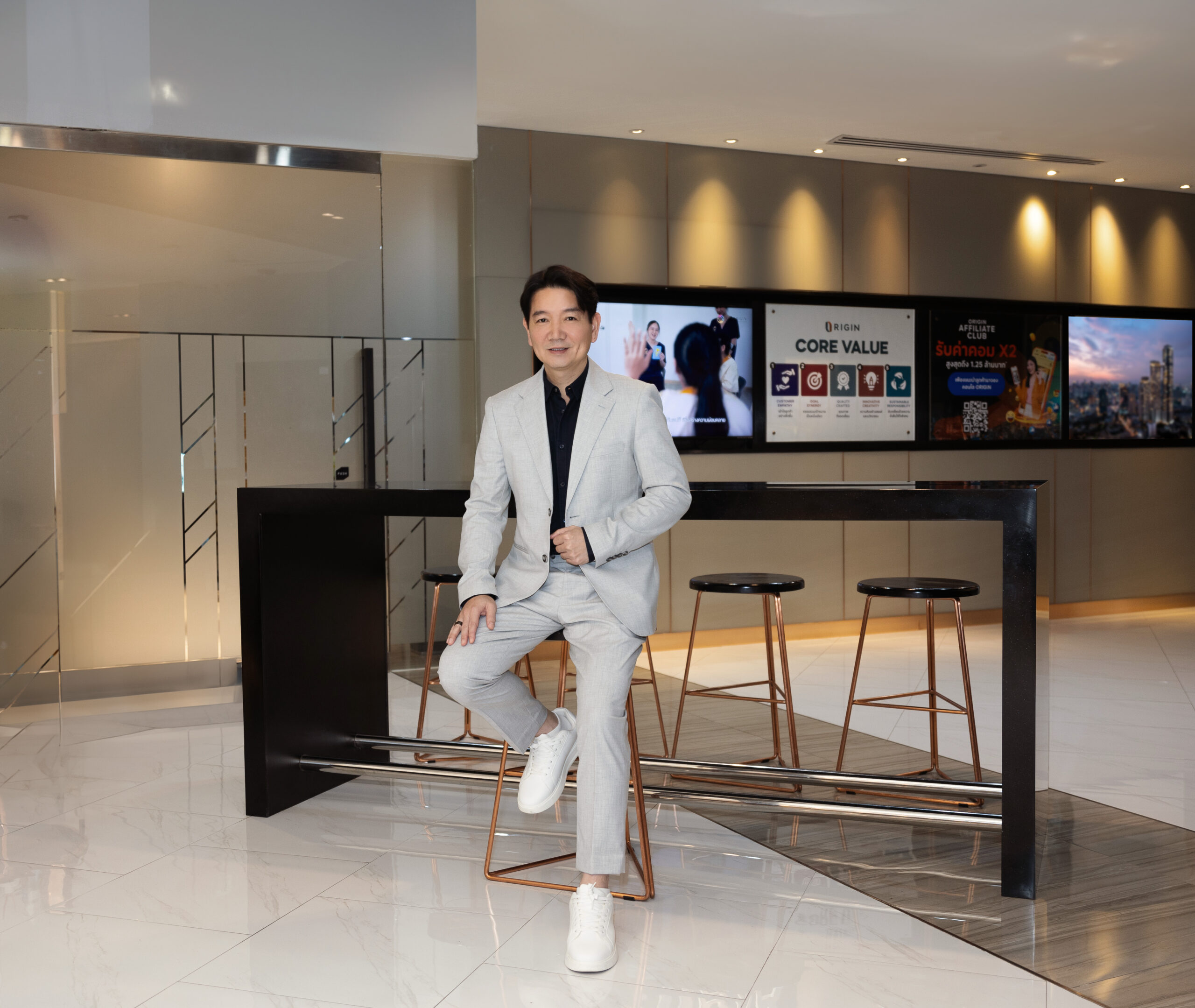 โดยปี 2568 สัดส่วนลูกค้าต่างชาติเติบโตขึ้นอย่างต่อเนื่อง มียอดขายรอโอนกรรมสิทธิ์อยู่ที่ 6,500 ล้านบาท กลุ่มลูกค้าต่างชาติหลักๆ จะเป็น รัสเซีย จีน ฮ่องกง ใต้หวัน พม่า เป้าหมายขยายฐานตลาดต่างประเทศเพิ่มมากขึ้น โดยไม่พึ่งพาชาติใดชาติหนึ่ง ลดความเสี่ยงและเพิ่มช่องทางการสร้างรายได้ต่อเนื่อง ตลาดต่างประเทศเป้าหมายใหม่ คือ โปแลนด์, มองโกเลีย และกลุ่มลูกค้าจากประเทศตะวันออกกลาง โดยผ่านเครือข่ายเอเจ้นท์ที่มีอยู่ทั่วโลก นอกจากนี้ ได้พัฒนาระบบให้ลูกค้าเข้าถึงสินค้าพร้อมอยู่ได้ง่ายขึ้นผ่านโปรแกรม “Origin iBooking” เพื่อให้ลูกค้าเข้ามาข้อมูล หรือจองบ้านคอนโดฯผ่านโปรแกรมนี้ได้ และยังดีเวลลอปโปรแกรมเพื่อรองรับการเปิดขายโครงการใหม่ๆด้วยเช่นกัน