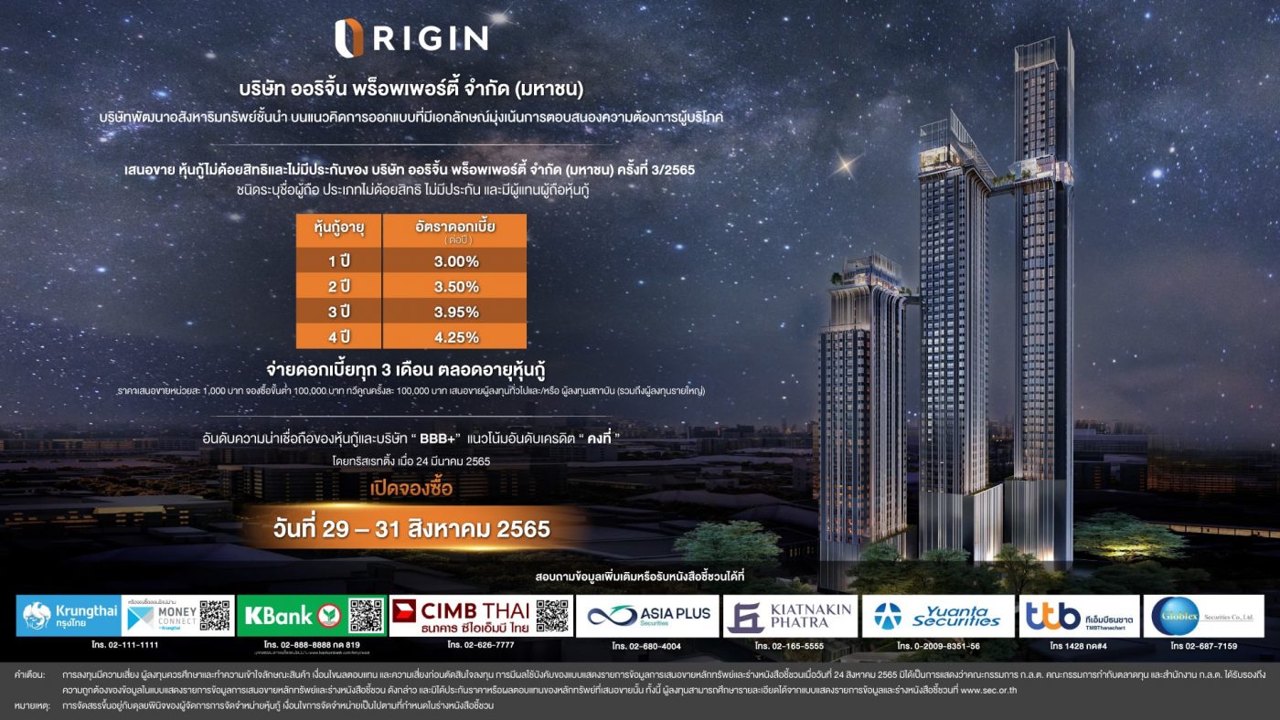 “ออริจิ้น” เปิดตัวหุ้นกู้ล็อตใหม่ เสนอ 4 ทางเลือกการลงทุน ชูดอกเบี้ย 3.00-4.25% ต่อปี เล็งเสริมแกร่งธุรกิจใหม่ เดินหน้าแผน Spin Off ส่งบริษัทย่อยเข้าตลาดหลักทรัพย์ฯ