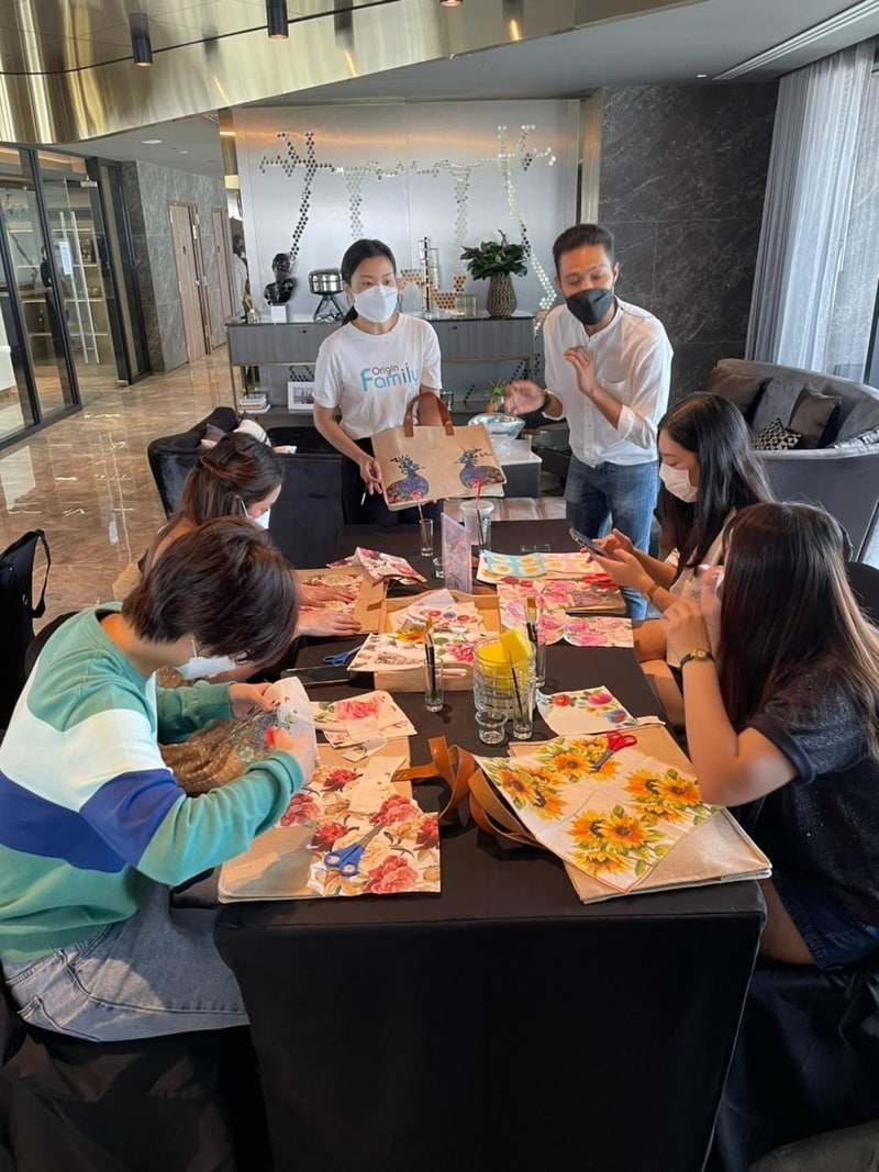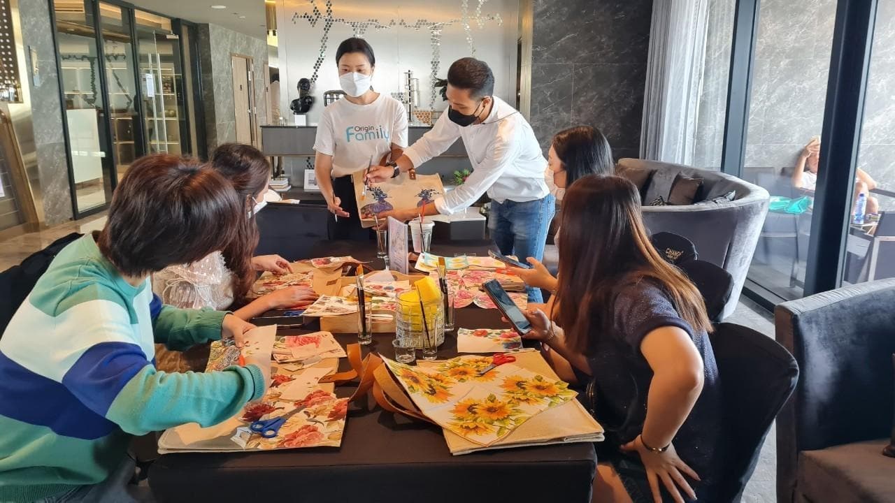 🎈ในกิจกรรมเวิร์คช็อปทำ “กระเป๋าเดคูพาจ” ให้ลูกบ้านได้ใช้จินตนาการออกแบบและสร้างสรรค์กระเป๋าตามสไตล์ของตัวเอง🛍️ ด้วยการเลือกลายกระดาษแนปกินที่มีสีสันสวยงาม นำมาตกแต่งกระเป๋าผ้าด้วยเทคนิค Decoupage 🌸🏵️🌺