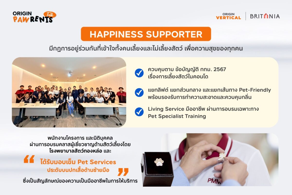 3. สร้างสัญลักษณ์ผ่านเข็ม Pet Services ด้วยการพัฒนาพนักงานนิติบุคคล ช่างอาคาร และแม่บ้านประจำโครงการให้เป็นมิตรกับสัตว์เลี้ยง (Pet Friendly) โดยพนักงานฯ ต้องผ่านการอบรม และผ่านการสอบตามเกณฑ์ที่กำหนด จะได้รับมอบเข็ม Pet Services และประดับบนปกเสื้อด้านซ้ายมือ ซึ่งเป็นสัญลักษณ์ของความเป็นมืออาชีพในการให้บริการ พร้อมให้การช่วยเหลือเบื้องต้นในด้านสัตว์เลี้ยง รวมถึงมีความเข้าใจและความใส่ใจในรายละเอียดด้านการดูแลสัตว์เลี้ยง พร้อมสร้างสรรค์พื้นที่อยู่อาศัยที่เป็นมิตรทั้งกับผู้อยู่อาศัยและสัตว์เลี้ยงอย่างแท้จริง