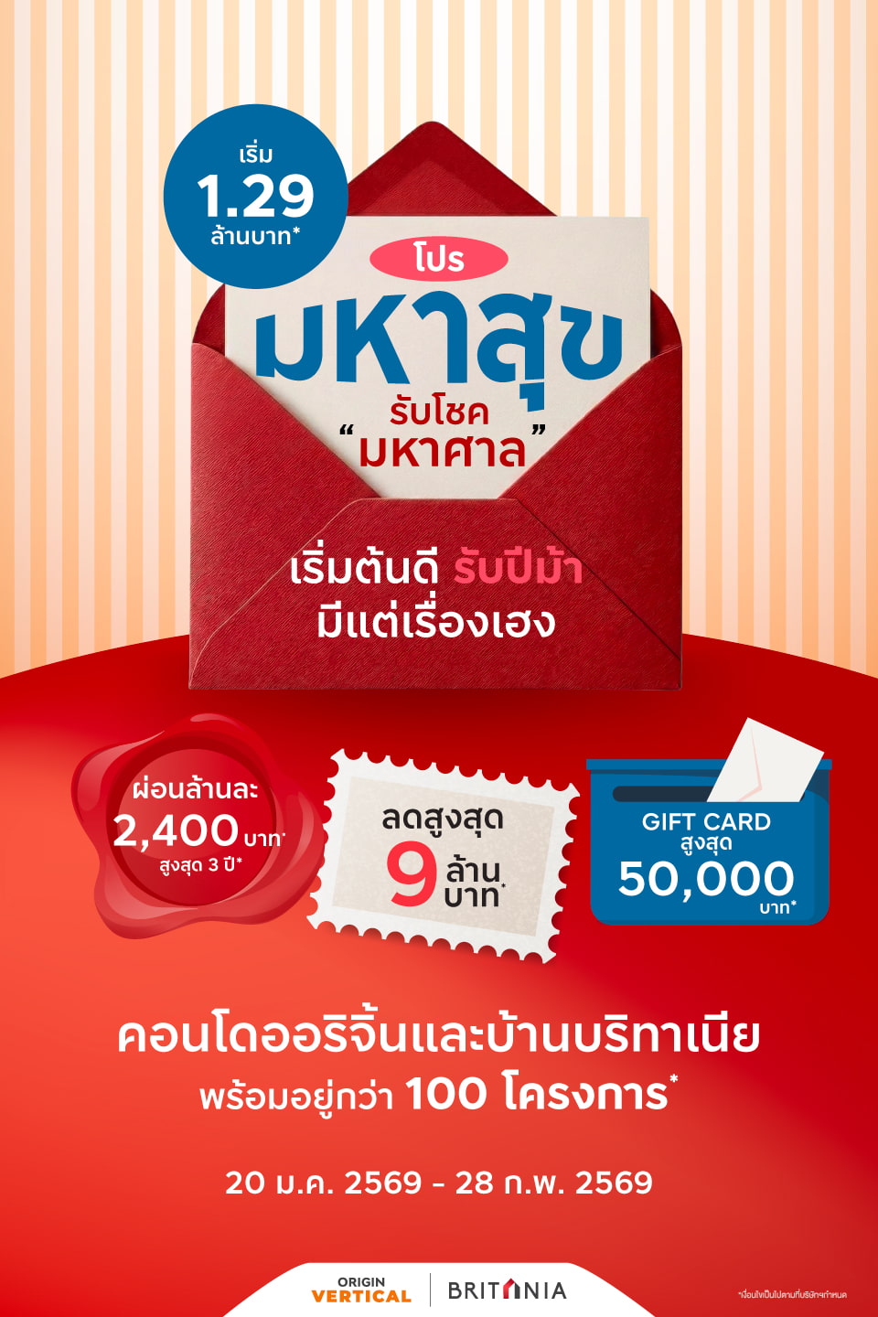 ** ลูกค้าจะได้รับเงินขวัญถุง (Visa Gift Card) ภายใน 60 วัน หลังจากครบกำหนดระยะเวลาของโครงการ (28 กุมภาพันธ์ 2569) ติดต่อรับได้ ณ [*สำนักงานขายโครงการที่โอนกรรมสิทธิ์] Visa Gift Card ไม่สามารถแลก/ทอน/เปลี่ยนแปลงเป็นเงินสดได้ เงื่อนไขและกำหนดระยะเวลาการใช้งานเป็นไปตามที่ธนาคารกรุงศรีอยุธยา จำกัด (มหาชน) เป็นผู้กำหนด